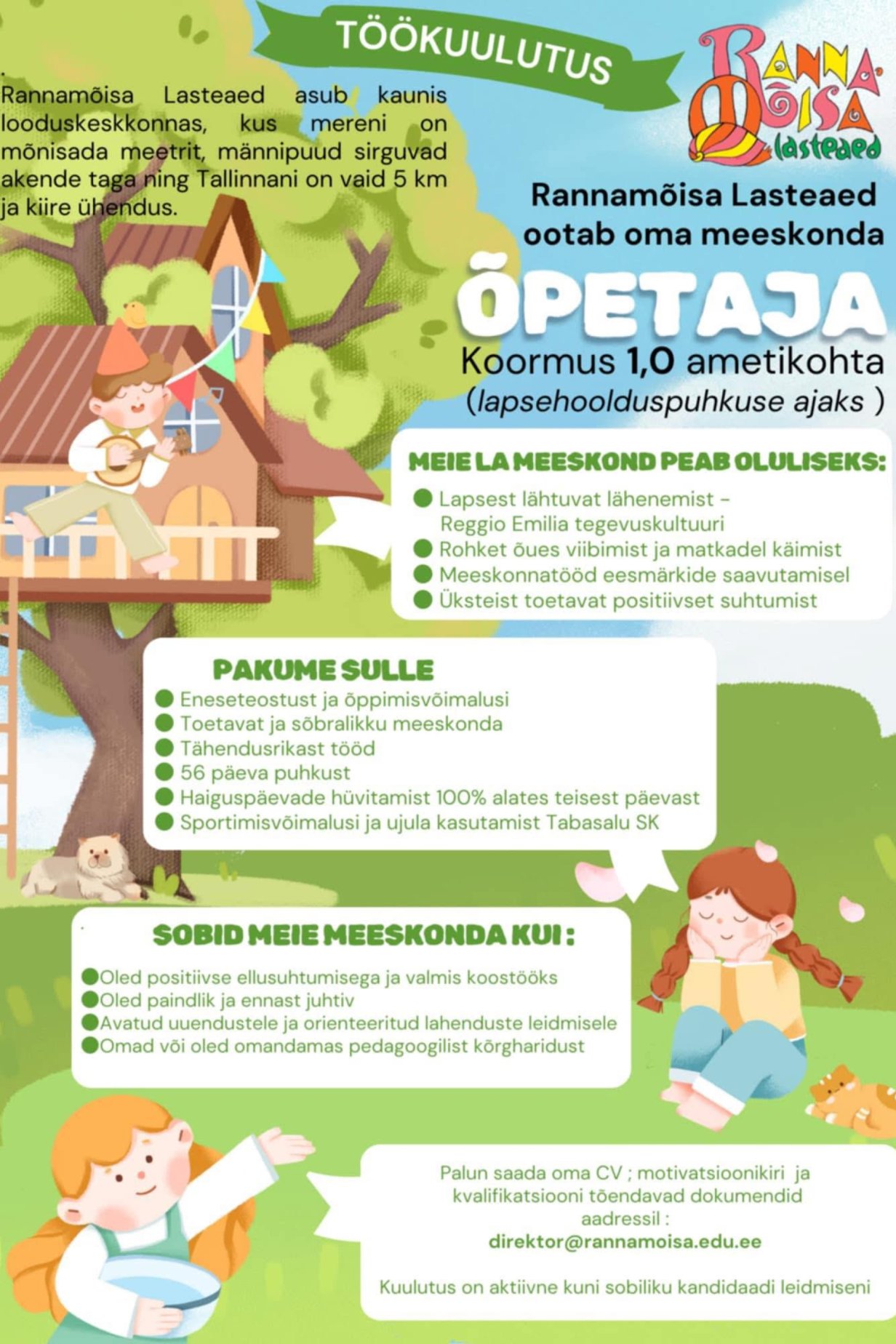 Oleme alati avatud toredatele ja pühendunud inimestele, kelle südamesooviks on töö lastega. Kui tunned, et laste arengu toetamine ja rõõmurohke keskkonna loomine Sind kõnetab, anna endast märku direktor@rannamoisa.edu.ee. Kes teab – ehk juhatab just see tee Sind tulevikus meie lasteaeda.